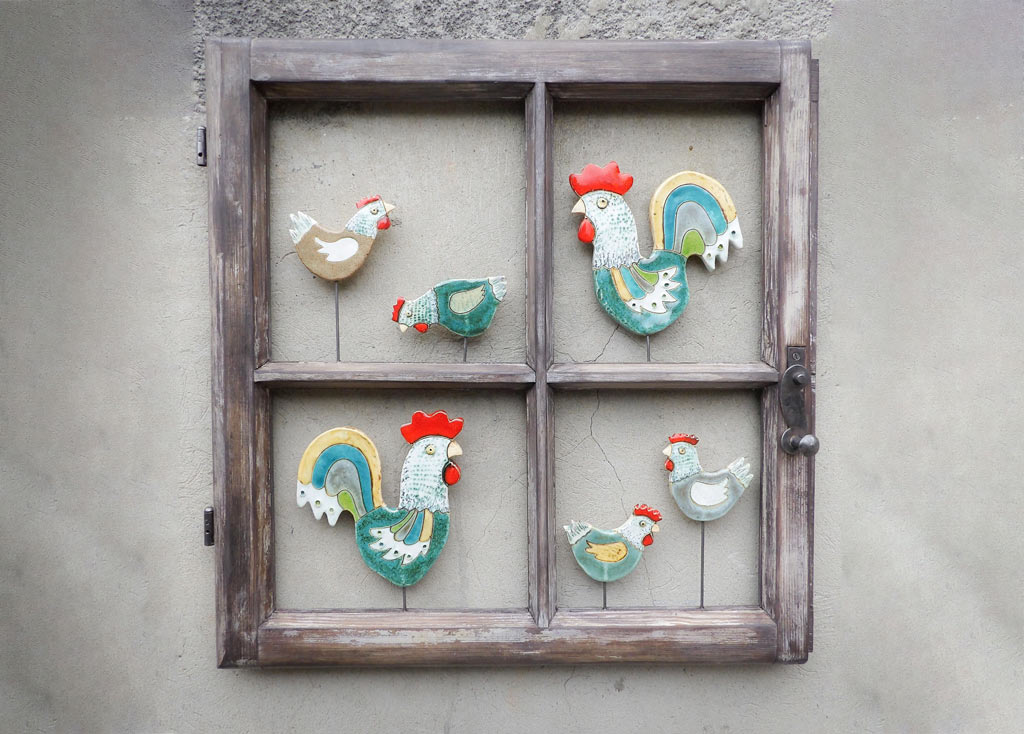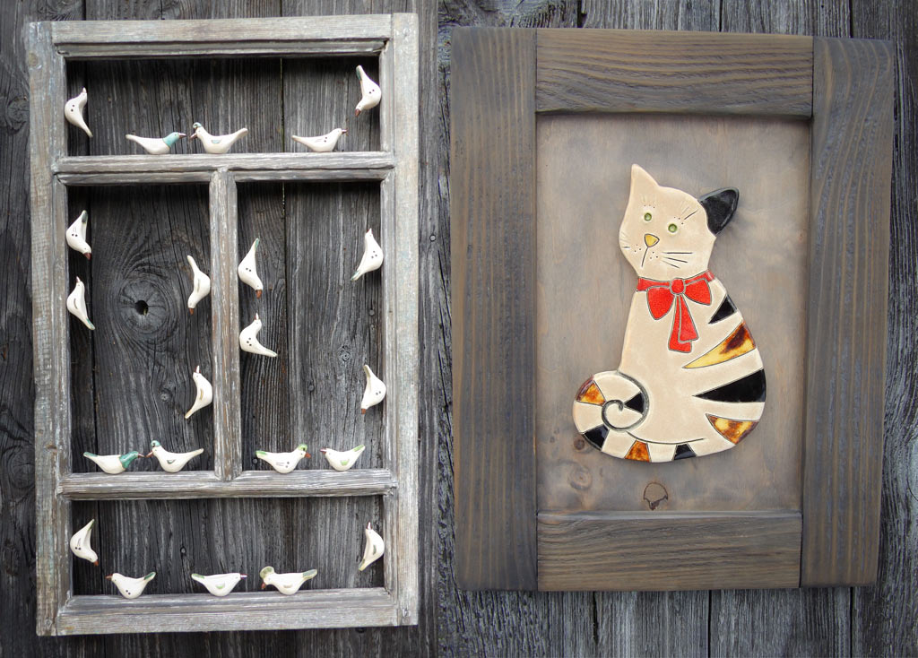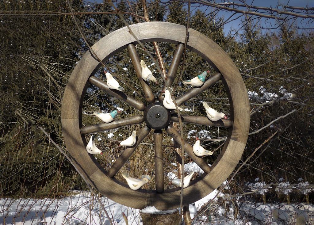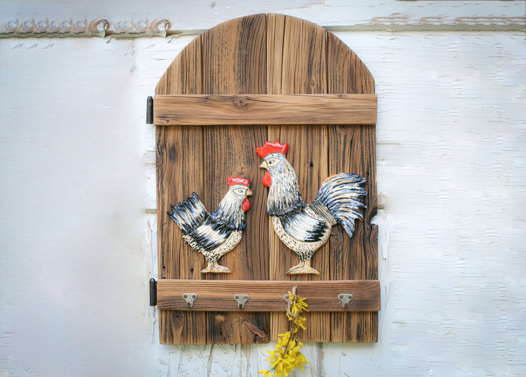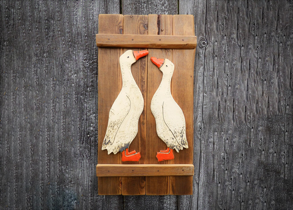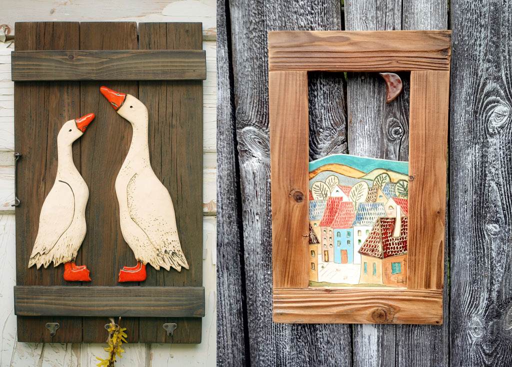 Kochamy stare rzeczy- oczywiście najbardziej te drewniane. Kiedy na giełdzie staroci spotykamy piękny przedmiot – od razu myślimy jak można wykorzystać go u nas w pracowni. Wtedy powstają wieszaki z gąskami, stare koła pełne ptaszków, drzwiczki z kogutkiem, skrzydła anielskie w startej ramie, wieszak w wieku starej beczki itp.